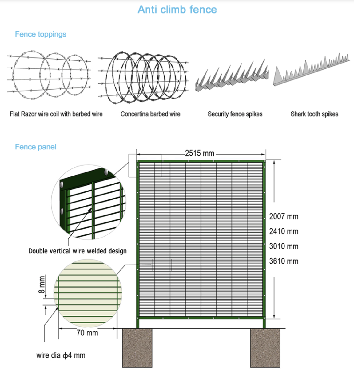 - Optional security toppings (razor wire, spikes)